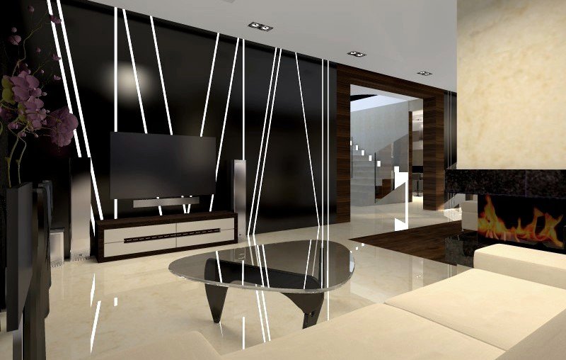 Z takich jak powyżej przedstawione założeń wyszliśmy tworząc wnętrze przestronnego domu dla czteroosobowej rodziny. Ekskluzywność i prestiż stosowanych elementów był jednym z głównych założeń. W parze z nimi szedł wymóg nowoczesności aranżacji oraz oczekiwanie również mniej standardowych, aczkolwiek eleganckich i dopasowanych do całej stylistyki, elementów. Z racji zakładanej przytulności materiały dobierane były w sposób mający ten cel osiągnąć. Szczególny nacisk położyliśmy na dobór gatunków kamienia o odpowiedniej kolorystyce i rysunku, wybór dopasowanych do nich gatunków i kolorów elementów fornirowanych i drewnianych. W aranżacji przeważa ciepła, jasna kolorystyka tworząca wrażenie domowej przytulności. W rożnych pomieszczeniach zastosowane są odmienne gatunki materiałów, choć zawsze podporządkowane są one ogólnej koncepcji kolorystycznej. Czarny akcent, pojawiający się w rożnych miejscach w różnej formie, urozmaica i dynamizuje stylizację dodając jednocześnie elegancji.