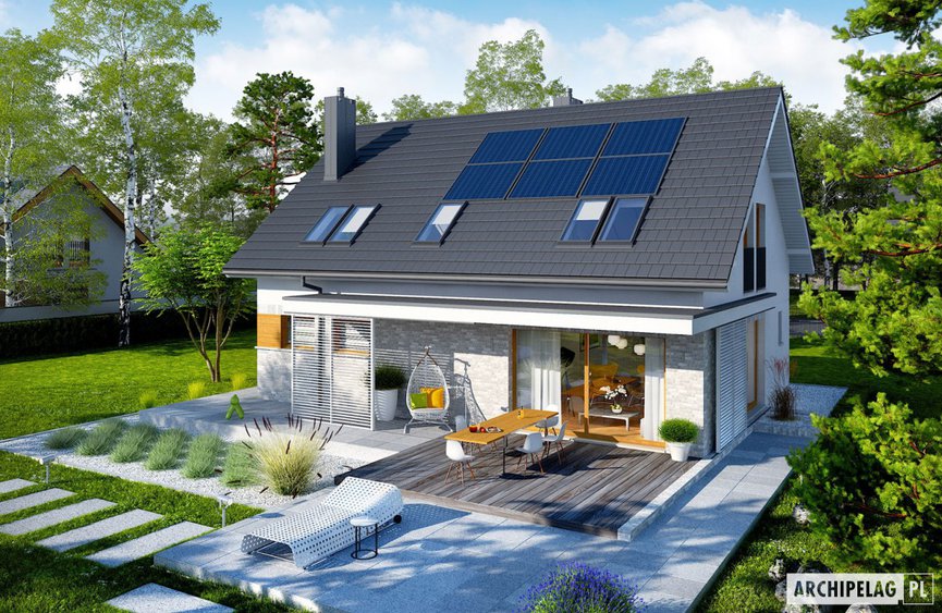 Stylowa elegancja i intrygujący wdzięk. Rodzinna strefa dzienna płynnie łączy się z tarasem, tworząc klimatyczną przestrzeń wypoczynkową. Przytulna strefa nocna na poddaszu. Znakomicie doświetlone wnętrze. Modna kompozycja elewacji.