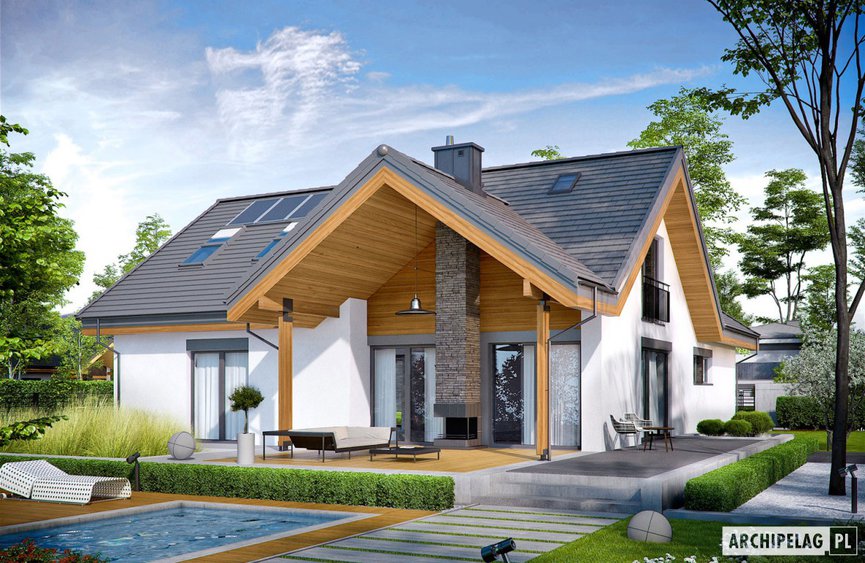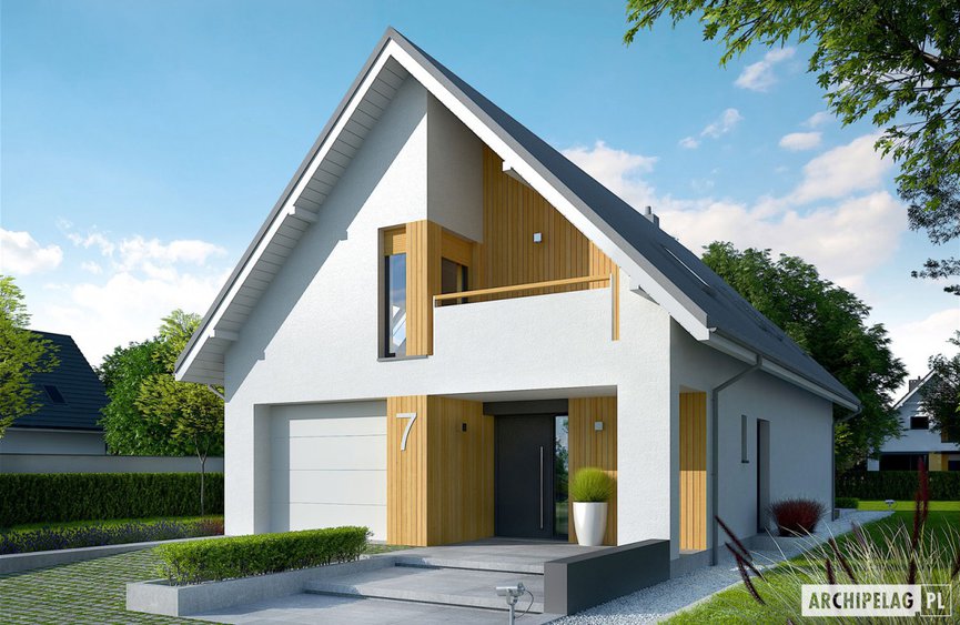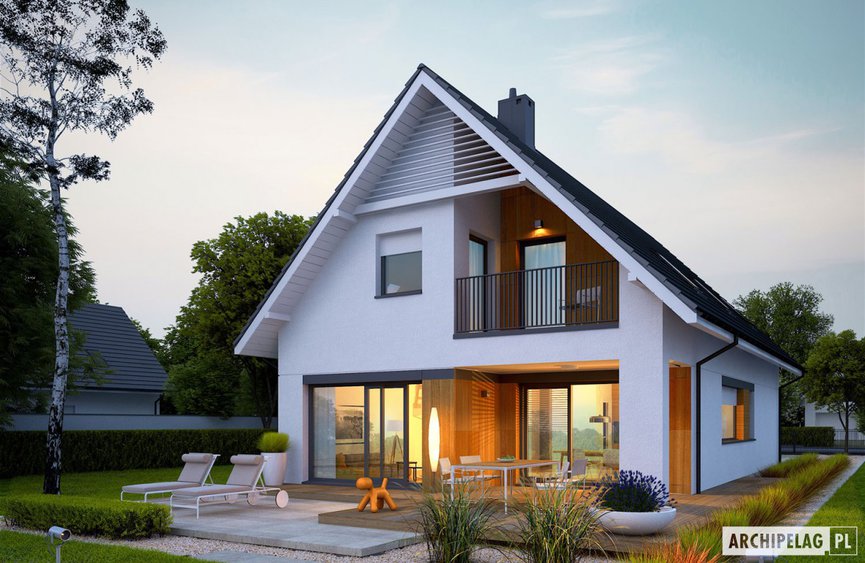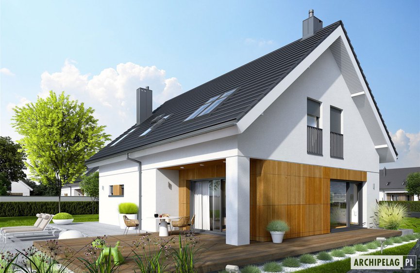 Nowoczesny szyk i funkcjonalna wygoda. Zwarta bryła prezentuje się modnie i elegancko, sprzyja energooszczędności i posiada bardzo dobre parametry cieplne. Efektowna elewacja to duet śnieżnobiałego tynku i elementów drewnianych. Przestronny i doskonale doświetlony układ funkcjonalny. Na częściowo osłoniętym tarasie można swobodnie odpoczywać nawet w pochmurne dni.