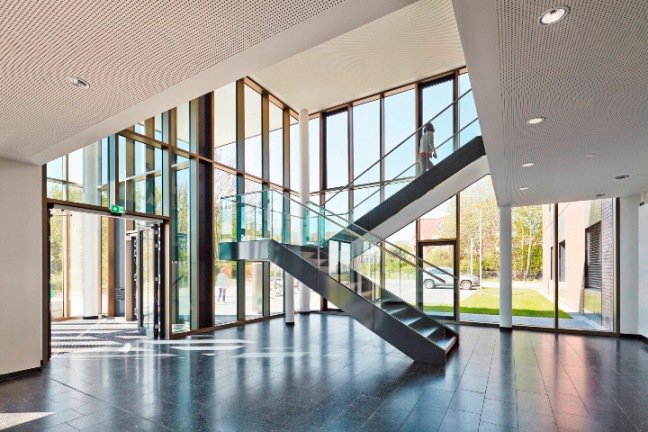 W budynku nowej biblioteki każda przestrzeń została jasno zdefiniowana i zaplanowana z najwyższą dbałością o szczegóły. Sercem nowego gmachu jest pięciopiętrowe skrzydło mieszczące półki o łącznej długości 50 km. Ta część obiektu jest łatwo dostępna dla pracowników administracyjnych dzięki centralnej arterii, łączącej odległe punkty. Na poziomie parteru zlokalizowano czytelnię otwierającą się na bujną zieleń ogrodu umiejscowionego w bocznej części kompleksu. Dzięki zastosowaniu dużych przeszkleń czytający mogą korzystać z naturalnego światła promieni słonecznych. Dźwiękoszczelne ściany działowe pozwalają odwiedzającym na studiowanie dokumentów w ciszy i spokoju. Tam, gdzie było to wymagane, zastosowano transparentne ściany działowe i drzwi w systemie Schüco Firestop T90, które dyskretnie oddzielają przestrzenie, zapewniając jednocześnie ochronę przeciwpożarową. Wszystkie elementy Schüco zostały kolorystycznie dopasowane do estetycznej stylistyki budynku – spokojny i głęboki ton RAL 7016 podkreśla industrialny charakter wnętrz.