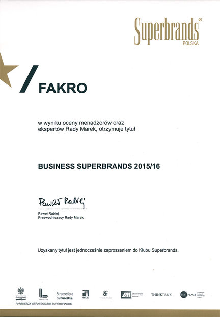 Firma FAKRO, wicelider światowego rynku okien dachowych została uznana za jedną z najsilniejszych marek na polskim rynku. Firma FAKRO otrzymała tytuł Superbrands 2015/16 i Created in Poland Superbrands 2015/ 16. Dodatkowo została wyróżniona tytułem Business Superbrands 2015/ 16.
