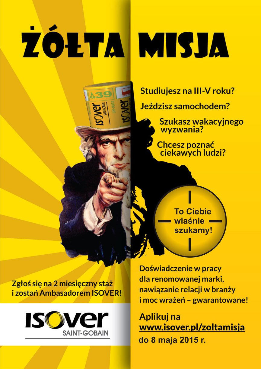 „Żółta Misja” to autorski program stażowy marki ISOVER – renomowanego  producenta materiałów izolacyjnych. Projekt organizowany jest od 2012 roku. Każdego roku, spośród nadesłanych aplikacji, wybieranych jest 15 studentów, którzy na czas wakacji stają się ambasadorami marki ISOVER. Do ich zadań należy reprezentowanie firmy wśród firm budowlanych i dystrybucyjnych na terenie danego regionu oraz podejmowanie działań z zakresu marketingu, promocji i sprzedaży. Uczestnicy wyposażeni we wszystkie niezbędne narzędzia pracy m.in. służbowy samochód, otrzymują możliwość pracy dla międzynarodowej marki, doświadczenie w kontaktach z firmami branży budowlanej, zdobycie wiedzy na temat izolacji i produktów ISOVER.