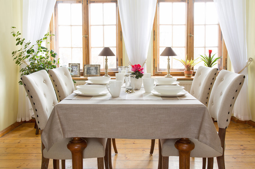 Podstawowym elementem wyposażenia jadalni są meble - stół i krzesła. Wybór jest duży, od klasycznych po nowoczesne. Jednak dopełnieniem aranżacji są tekstylia - obrus, zasłony, rolety, siedziska na krzesła i inne, które nadają pomieszczeniu stylu.