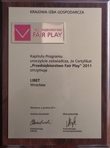 LIBET z certyfikatem „Przedsiębiorstwo FAIR PLAY 2011”