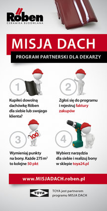 Misja Dach to nowy program partnerski dla dekarzy, organizowany przez firmę Röben. Za zakup dachówek marki Röben wykonawca otrzymuje bony, które można wykorzystać w sklepie internetowym toya24.pl