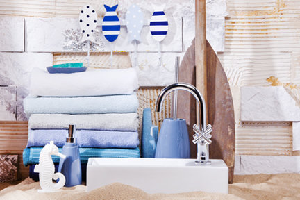 Morskiego akcentu nie może zabraknąć także w łazience. Błękitne ręczniki, poręczna torba w granatowo-białe pasy z naszywką przedstawiającą kotwicę, koszyczki na akcesoria w marynarskim stylu czy świece w kształcie muszli będą doskonałym dodatkiem do „morskiej” łazienki. Całość uzupełnią oryginalne wieszaki w kształcie rybek.