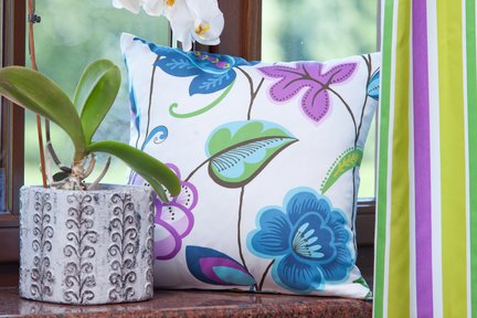 Fleur - nowość od Dekoria.pl - to tkaniny oraz gotowe produkty o uroczym motywie kwiatowym. Współczesny design - nieco bajkowy, orientalny - doskonale wpisuje się w nowoczesny charakter wnętrza. Kwiatowy deseń połączony z koordynatem w energetyczne paski tworzy oryginalne kompozycje kolorystyczne, które ożywią wystrój pomieszczenia. Zaletą kolekcji jest jej uniwersalność. Doskonale sprawdzi się w dekoracji sypialni, ale także salonu czy nowoczesnych pokoi dziecięcych.