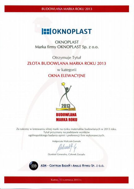 W czerwcu OKNOPLAST został także uhonorowany tytułem Złota Budowlana Marka Roku 2013. Ranking ten jest organizowany przez ASM – Centrum Badań i Analiz Rynku i wyłania najbardziej uznane firmy z branży budowlanej. Tytuły przyznawane są tu na podstawie ogólnopolskiego badania CATI (Computer Assisted Telephone Interview), prowadzonego wśród odbiorców produktów budowlanych.