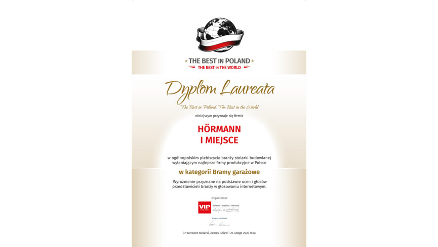 Podczas 37. Konwentu Stolarki VIP, który odbywał się pod koniec lutego w Gniewie, ogłoszono wyniki Plebiscytu Branżowego „The Best in Poland, The Best in the World”. Wyłoniono najlepsze firmy produkcyjne w Polsce w 11 kategoriach, obejmujących kluczowe segmenty rynku. W głosowaniu wzięło udział 1390 przedstawicieli branży stolarki otworowej. W gronie najwyżej ocenianych przedsiębiorstw znalazła się firma Hörmann Polska, która zajęła I miejsce w kategorii Bramy garażowe oraz II w kategorii Drzwi Stalowe, Kompozytowe, Aluminiowe, Hybrydowe.