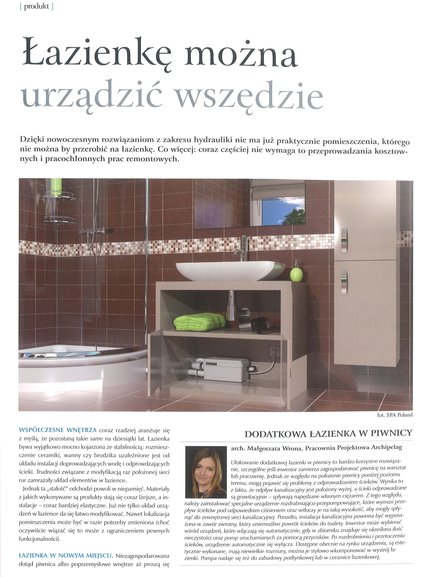 W punktach sprzedaży prasy pojawił się najnowszy numer periodyku „Łazienka”. Wśród rozlicznych tematów z branży sanitarnej, pojawił się artykuł na temat łazienek lokowanych na różnych poziomach domu m.in. w piwnicy. W tej kwestii głosem eksperckim podzieliła się  nasza architektka Małgorzata Wrona.