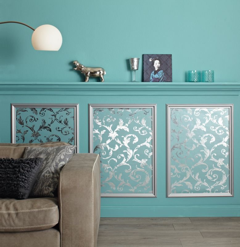 Kilka prostych zabiegów dekoratorskich wystarczy, by pozbawione ozdób mieszkanie w bloku nabrało wyjątkowego charakteru. Zastosowane przez nas elementy ozdobne są ujednolicone stylistycznie. Kolor ścian dopasowano do podstawowego, turkusowego odcienia tapety. Farba ścienna idealnie współgra, ponieważ została zmieszana na wzór tapety w markecie budowlanym. Uzyskanie harmonijnego efektu wymaga także zachowania właściwych proporcji. W przypadku pomieszczeń o wysokości 2,50 m poziomy dekoracyjny występ (gzyms) z szerokiego ozdobnego profilu najkorzystniej umieścić na wysokości 1,10 m. Kasetony o wymiarach 80 x 60 cm powinny być rozmieszczone w odstępach co 12 cm. Tworzące kasetony profile szerokości 4 cm należy pomalować na kolor srebrny, dzięki czemu barokowa ornamentyka tapety zostanie dodatkowo uwypuklona.