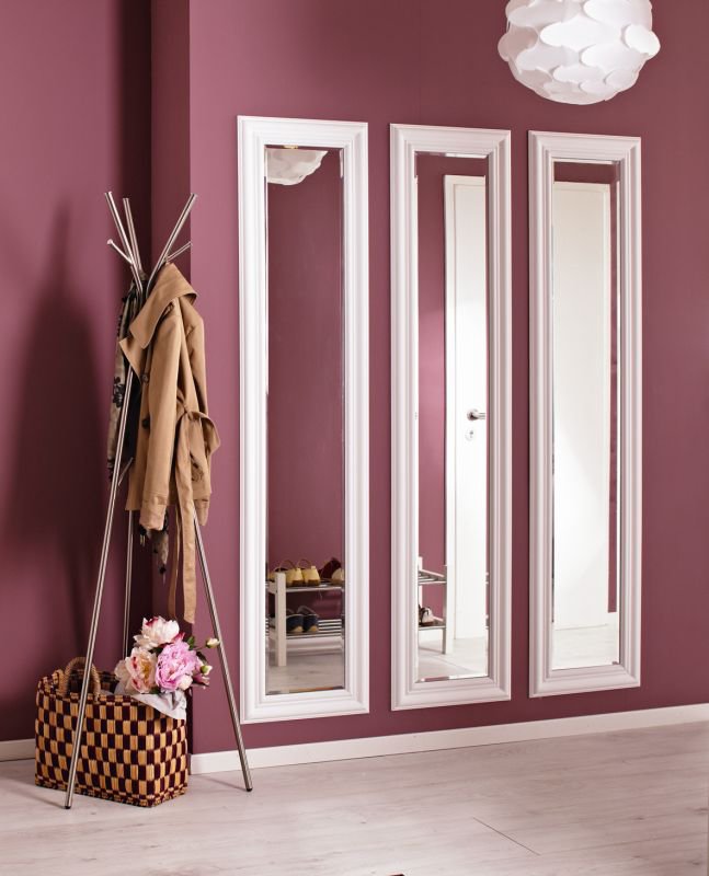 Przedpokój to wizytówka mieszkania. Lustro ujęte w sztukateryjne ramy powiększa go optycznie i jest bardzo eleganckie. Jeszcze bardziej efektownie wygląda kilka ram umieszczonych na ścianie w jednym rzędzie. Lustra ze szlifowanymi krawędziami powinny mieć wysokość 165 cm i szerokość zaledwie 26 cm. Obramowane profilami szerokości 8 cm będą wyglądały ciekawie. Na charakter wystroju przedpokoju duży wpływ ma także umiejętnie dobrany kolor ścian.