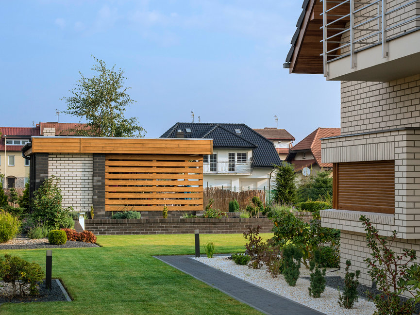 W projekcie wykorzystano ok. 12 tys. sztuk cegieł klinkierowych, które użyto także do wybudowania nowoczesnego w formie ogrodzenia oraz niewielkiej altanki przeznaczonej do przechowywania drewna, rowerów i narzędzi ogrodowych. Cegłę wykorzystano także do aranżacji strefy wejściowej domu. Podświetlone pojemniki na rośliny stanowią prosty, ale efektowny element całego projektu.