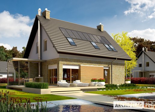 Spacerując wokół domu Tobiasz G1 mamy okazję zobaczyć jak bryła budynku z ciekawie wkomponowanym garażem pięknie prezentuje się na działce. Nowoczesny charakter budynku akcentuje intrygująca mikstura materiałów i kolorów, zastosowanych do wykończenia elewacji, będąca udanym połączeniem klinkieru, ascetycznej bieli tynku i naturalnego drewna. Uwagę przyciąga rozległy, wygodny taras z dekoracyjną pergolą, w którego przestrzeni domownicy mogą cieszyć się blaskiem zewnętrznego kominka. Taras od wiosny do późnej jesieni przejmuje również funkcję dodatkowej jadalni, zachęcając do rodzinnych posiłków na świeżym powietrzu. Dzięki zastosowaniu dużych przeszkleń granica między domem a ogrodem subtelnie się zaciera, a wnętrza zostają maksymalnie doświetlone naturalnym światłem. Zgodnie z najnowszymi trendami w architekturze, na dachu dumnie połyskują kolektory słoneczne.