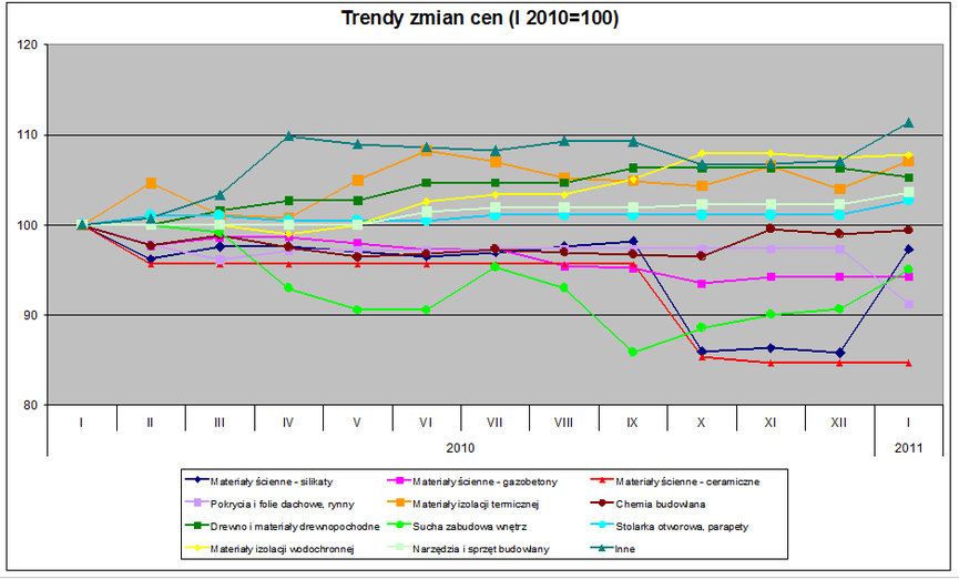 W styczniu 2011 r., w porównaniu do poprzedniego miesiąca, wzrosły ceny w 7 grupach: najwięcej silikatów (o 13,4%), suchej zabudowy wnętrz (+4,9%) i materiałów izolacji termicznej (+3%). Ceny materiałów ściennych ceramicznych nie zmieniły się, a w 3 grupach ceny spadły, w tym znacząco pokryć i folii dachowych, rynien (o 6,3%). W zbiorczej kategorii „inne” ceny wzrosły (o 3,5%), a to za sprawą wzrostu o 17,1% cen wyrobów stalowych oraz paroprocentowych wzrostów cen instalacji i techniki grzewczej, kanalizacji, odwodnień, wentylacji oraz płytek ceramicznych, wyposażenia łazienek i kuchni.