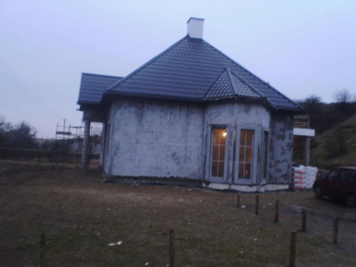 Blachodachówka już położona ;-) Wygląda ślicznie.Dom ma być biały z siwymi wypustami i cokołem.