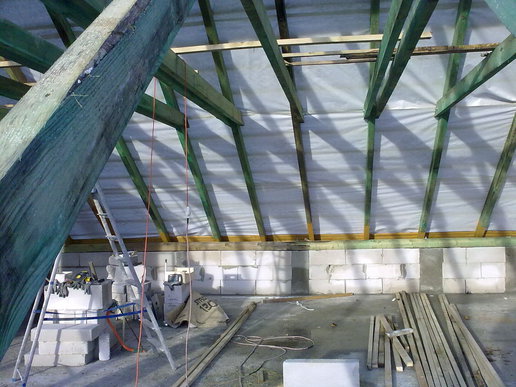 Witam! Ja jestem na etapie więźby dachowej. Ze zmian w projekcie to rezygnacja z okienek w spiżarni, i na klatce schodowej - połaciowe pozostaje. Dodatkowo przymierzam sie do rezygnacji z balkonu na wykuszu, w to miejsce chcę zrobić daszek. Aha, dość długo dyskutowałem z cieślą na temat przekroju krokwi, twierdził że na dachówkę cementową jest trochę za mały. Postanowiłem więc wzmnocnić dach płatwiami z obu stron przez całą długość, podpartymi w czterech miejscach.