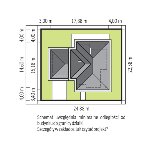 - Minimalne wymiary działki 24.88 x 22.58 m