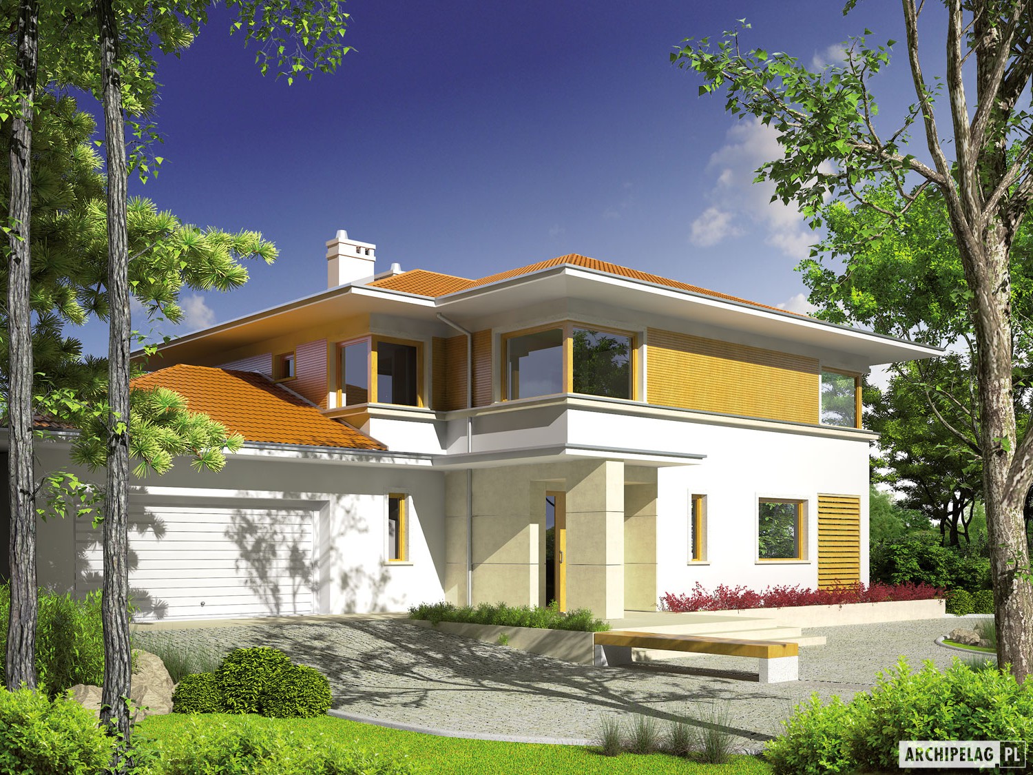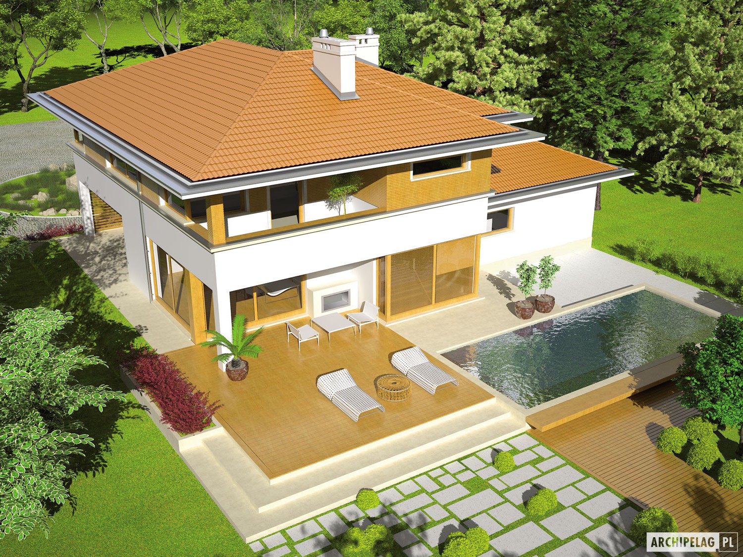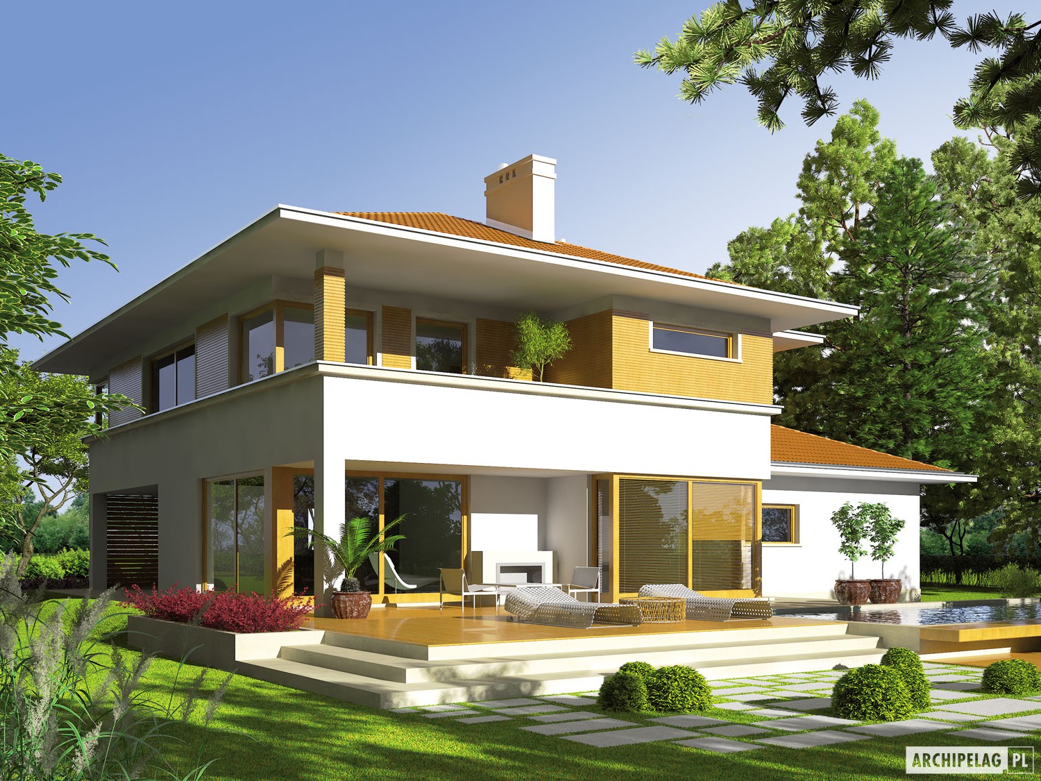 Diego II G2 to efektowny projekt okazałego domu piętrowego z dachem wielospadowym. Ponad 200 m2 powierzchni zapewnia przyszłym mieszkańcom wymarzone warunki do życia i wypoczynku. Do ich dyspozycji, oprócz dwustanowiskowego garażu, są m.in. cztery sypialnie, dwie garderoby, gabinet i kuchnia połączona z jadalnią. Na otoczenie budynku składa się taras z desek kompozytowych ProDeck w kolorze złoty dąb. Panele tarasowe nie tylko wyglądają atrakcyjnie, ale również gwarantują komfortowe, bezproblemowe, niewymagające impregnowania ani odświeżania użytkowanie. Całości dopełniają liczne przeszklenia i balkony pasujące do reprezentacyjnego charakteru domu.