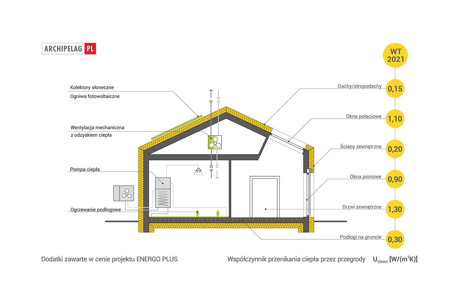 Wskaźnik EP dla domu z wentylacją mechaniczną, pompą ciepła oraz kolektorami słonecznymi (szczegółowe dane w charakterystyce energetycznej)