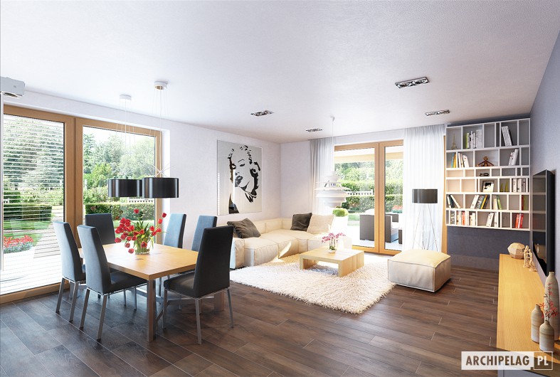 Elegancja, nowoczesna forma, funkcjonalność – tak w trzech słowach opisać można projekt Kornel VI (z wiatą) ENERGO. To przykład parterowego domu, który doskonale nadaje się do zamieszkania przez 3-4-osobową rodzinę. Wyraźny podział na strefy dzienną i nocną, przestronny salon, a także przemyślany układ pomieszczeń gwarantują możliwość pracy i wypoczynku. Duży pokój połączony z jadalnią stworzony jest z myślą o integracji domowników i ich gości. Sprzyja jej także przydomowy taras z desek kompozytowych firmy ProDeck w kolorze złoty dąb. Kameralny charakter tego miejsca cieszy oko i tworzy przytulny, sielski klimat. Warto zauważyć, że wykorzystane w projekcie deski ProDeck nie tylko gwarantują jakość, trwałość i świetny wygląd na lata, ale również nie wymagają impregnacji i konserwacji – co wpisuje się w jego ergonomiczne założenia.
