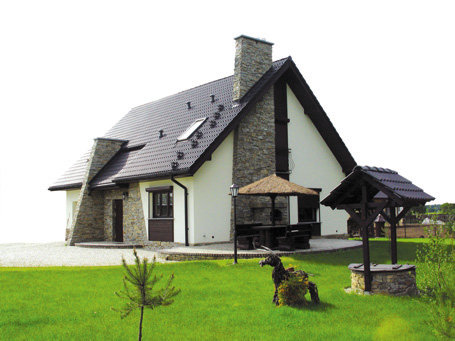Szczególną rolę w projekcie pełnią: zewnętrzny kominek, połączona z kominem wentylacyjnym ściana osłaniająca wejście na elewacji frontowej oraz kamienna i drewniana okładzina. W prezentowanej realizacji wszystkie te elementy zostały zachowane, zmieniona została natomiast kolorystyka elewacji.