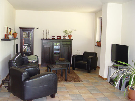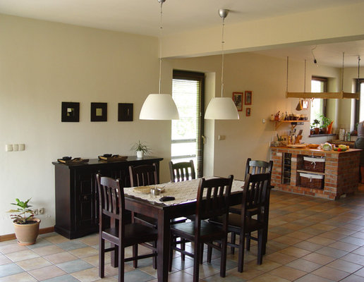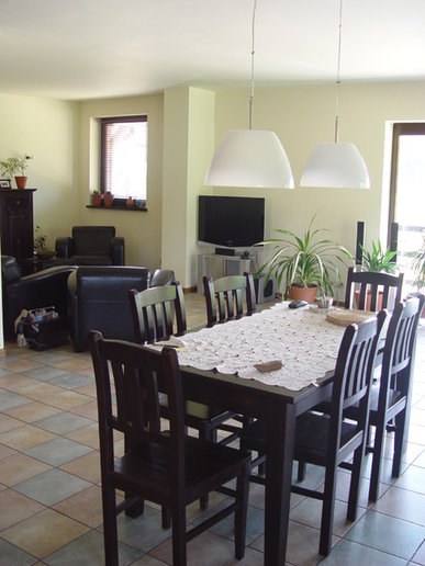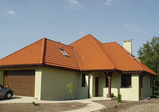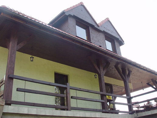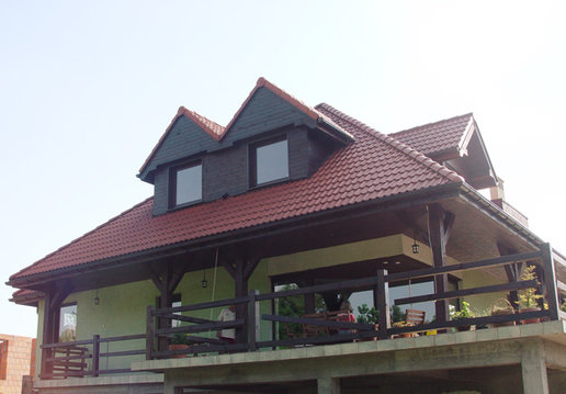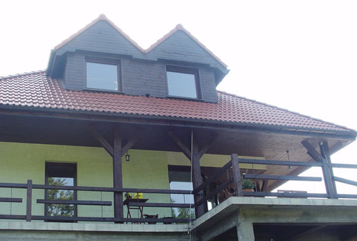 Prezentowana "Delfina" stoi na zboczu w związku z czym inwestorzy zdecydowali się na jej podpiwniczenie i umieszczenie tarasu na znacznej wysokości ponad ogrodem. W podpiwniczeniu - poza kotłownią i pomieszczeniem gospodarczym - znalazły swoje miejsce basen z bezpośrednim wyjściem na ogród sauna i pokój ćwiczeń. Zmianie uległ również układ pomieszczeń na poddaszu gdzie zrezygnowano z dwóch balkonów (jedna z sypialń ma dzięki temu dużą garderobę). Odpowiednia temperatura w domu utrzymywana jest za pomocą ogrzewania podłogowego zasilanego pompą ciepła.