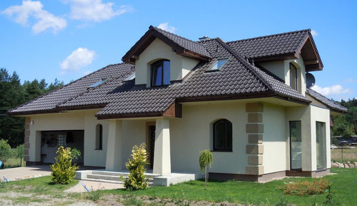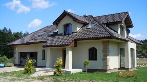 Reprezentacyjna, choć tradycyjna w formie, bryła domu Iwa G2 nie pozwala przejść obok niego obojętnie. Uwagę przyciąga subtelna kompozycja elewacji utrzymana w jasnych, ciepłych barwach. Inwestorzy wprowadzili kilka zmian w projekcie gotowym – uprościli kształt stolarki okiennej, zrezygnowali z balkonu nad wykuszem oraz zmodyfikowali położenie i przeznaczenie pomieszczeń, np. zbudowali saunę.