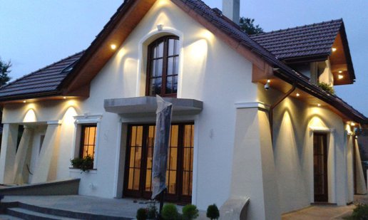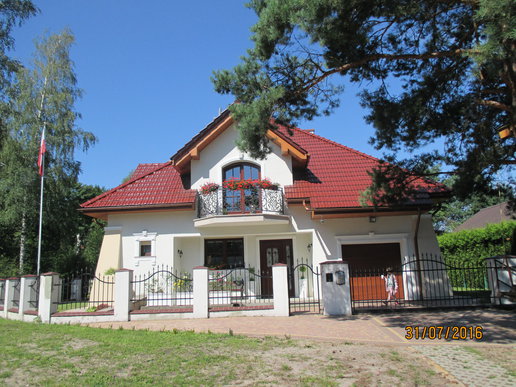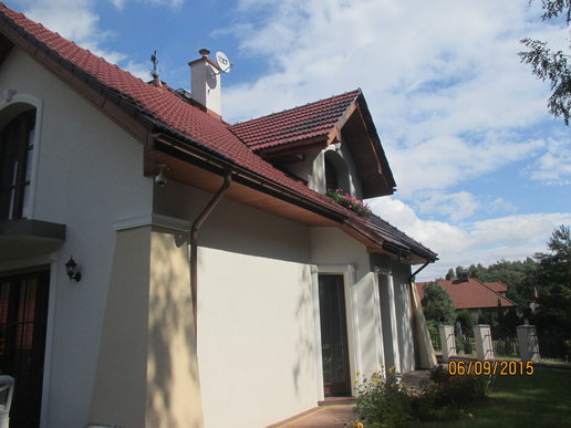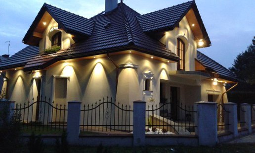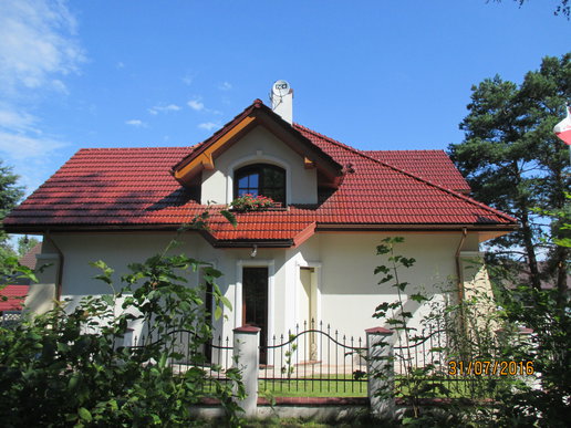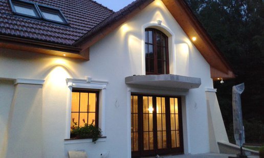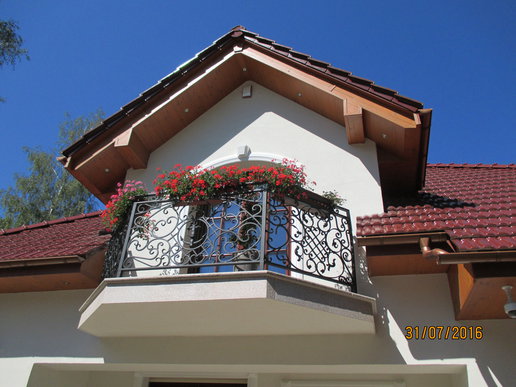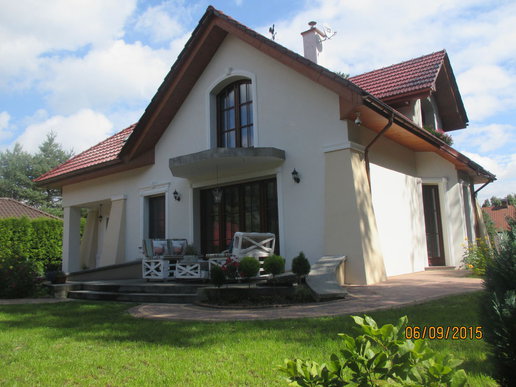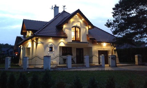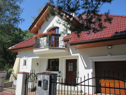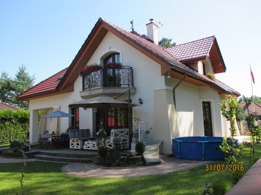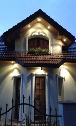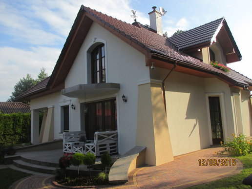 Inwestorom zależało na zachowaniu oryginalnego charakteru budynku, dlatego starali się nie ingerować mocno w kształt bryły. Nie obyło się jednak bez drobnych modyfikacji. Właściciele zdecydowali się na podniesienie ścianki kolankowej, dzięki czemu pomieszczenia na poddaszu stały się większe i bardziej ustawne. Zmiana wysokości została jednak przeprowadzona, w taki sposób, aby nie zaburzyć doskonałych proporcji budynku. Drobnym korektom uległa także wielkość solarki okiennej. Inwestorzy zdecydowani się także na finezyjne zdobienia wokół okien, drzwi i bramy garażowej. Elewację zdobi subtelna kolorystyka utrzymana w tonacji bieli i beżu, które pięknie korespondują z czerwienią dachówki.