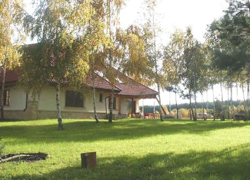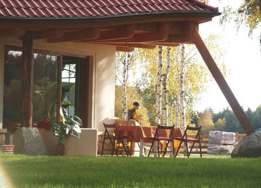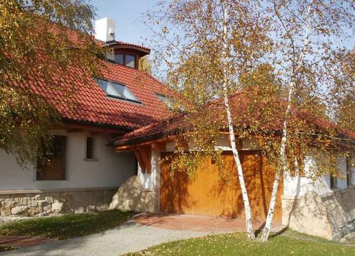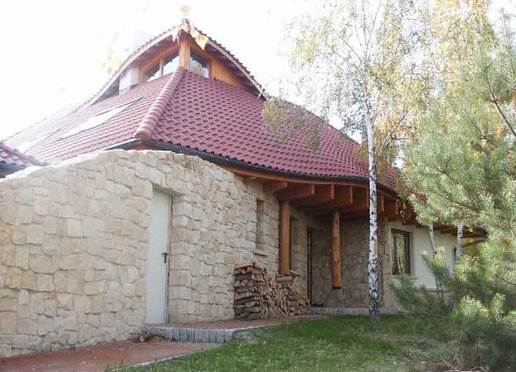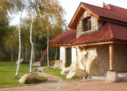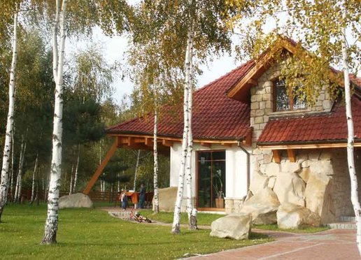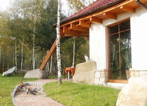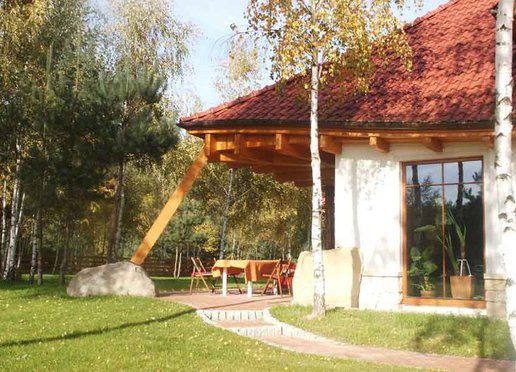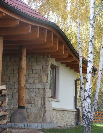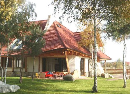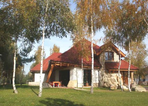 Oto dom który znakomicie wkomponowuje się w otoczenie zwłaszcza wśród przybranych w jesienne sukienki młodych brzóz. Zarówno kolororystyka jak i skomplikowana bryła budynku powodują że dom znakomicie współgra z krajobrazem nie narzucając się przy tym mimo swych imponujących rozmiarów. Elewacje wykończone w znacznej części kamieniem wszechobecne drewno i falista linia dachu nadają budynkowi charakter wiejski jednak jego rozmiary przywodzą na myśl raczej dworek szlachecki. To wrażenie pogłębiają słupy z drewnianych bali na kamiennych cokołach podtrzymujące dach nad gankami. W rzeczywistości dom jest bardzo nowoczesny nie tylko ze względu na użyte materiały lecz również a może przede wszystkim na konstrukcję.