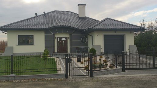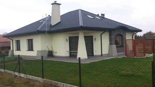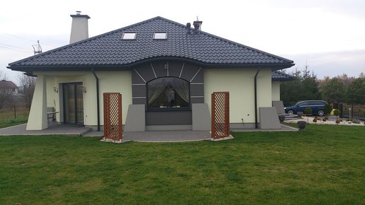Realizacja domu zachwyca pięknym i starannym wykonaniem. Inwestorzy wykonali niewiele zmian w stosunku do oryginalnego projektu – zamontowali kilka okien połaciowych w celu oświetlenia poddasza oraz zrezygnowali z zewnętrznego kominka na tarasie. Elewacja została ubrana w piękne, stonowane barwy – jasny tynk przepleciono z subtelnymi szarościami. W ten ponadczasowy kolor ubrano także rozrzeźbiony dach z charakterystyczną falistą linią, która podkreśla unikalny charakter domu i nadaje mu niepowtarzalny styl.