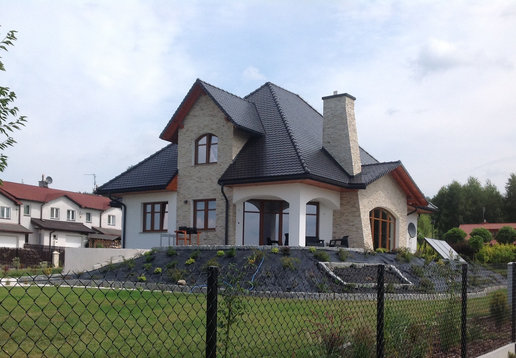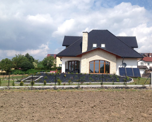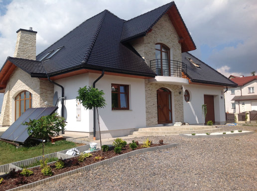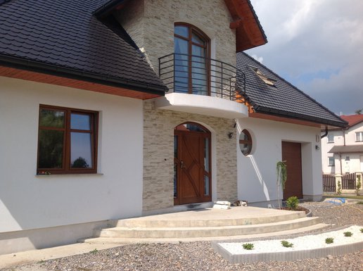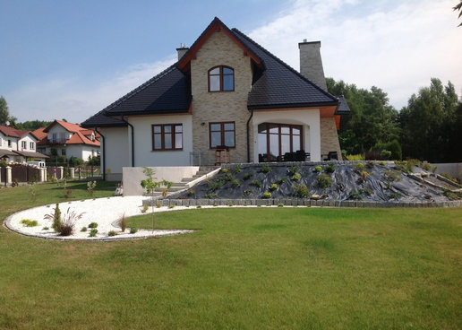 Realizacja projektu Melania G1 przyciąga uwagę finezyjną bryłą i piękną elewacją. Dom został wybudowany na działce ze spadkiem, co wymusiło wymodelowanie ogrodu, który w tej formie prezentuje się bardzo atrakcyjnie. Inwestorzy wprowadzili kilka zmian w projekcie, m.in. zaplanowani balkon nad strefą wejściową oraz zrezygnowali z kominka zewnętrznego.