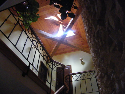 W projekcie na parterze domu zaplanowano część dzienną, w której znajdziemy kuchnię, przestronny pokój z jadalnią, toaletę, przydatne pomieszczenia gospodarcze oraz dwa pokoje z wyjściami na taras, które mogą pełnić rolę pokoi dla gości, gabinetu lub pokoju wypoczynkowego. Pozostawienie pustej przestrzeni nad holem pozwala na wizualny kontakt z korytarzem poddasza. Strefa nocna poddasza kryje w sobie trzy sypialnie, garderoby, łazienkę i strych.