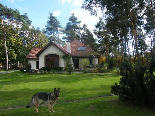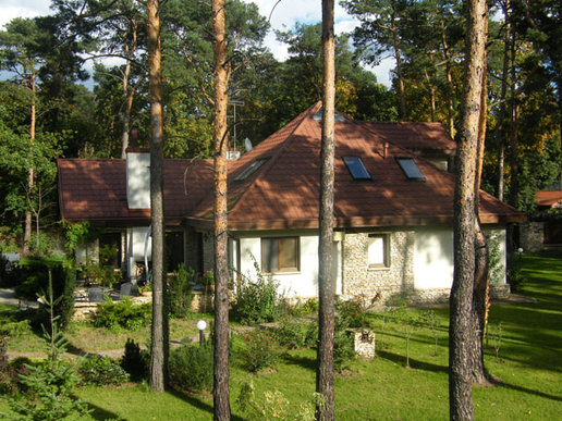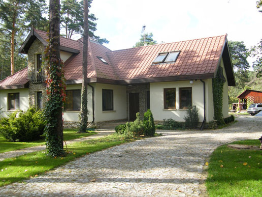 Prezentowana realizacja projektu "Oliwia" robi wrażenie. Budynek, mimo zastosowania w centralnej części szeroko osadzonego kopertowego dachu oraz masywnego komina nie wydaje się być ciężki. Lekkości całej bryle dodają od strony tarasu duże przeszklenia, przez które wpada znaczna ilość światła doświetlającego wnętrze, a od strony wejścia wykusz z wydłużonym pasmem elewacji z okładziną. Całość ciekawie uzupełnia mocno podkreślona krawędź dachu. Dom powstał w województwie mazowieckim w 2008 roku. Właściciele nie wprowadzili zbyt wielu zmian w stosunku do oryginalnego projektu. Wielkość i ilość okien została zmieniona oraz zlikwidowano funkcję pomieszczenia zaplanowanego jako garaż, a bramę garażową zastąpiły okna.