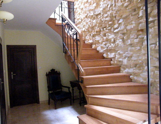 W projekcie na parterze domu zaplanowano część dzienną, w której znajdziemy kuchnię, przestronny pokój z jadalnią, toaletę, przydatne pomieszczenia gospodarcze oraz dwa pokoje z wyjściami na taras, które mogą pełnić rolę pokoi dla gości, gabinetu lub pokoju wypoczynkowego. Pozostawienie pustej przestrzeni nad holem pozwala na wizualny kontakt z korytarzem poddasza. Strefa nocna poddasza kryje w sobie trzy sypialnie, garderoby, łazienkę i strych.
