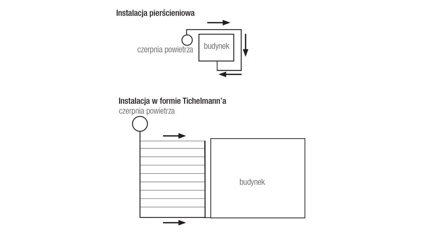 Średnica rur, długość instalacji oraz metoda ułożenia zależy w pierwszej kolejności od wielkości wymiany powietrza. W celu zapewnienia stałych warunków oraz pożądanej częstotliwości wymiany powietrza, prędkość przepływu powietrza powinna oscylować na poziomie 1 m/s – 3 m/s. Przekroczenie tej prędkości wpływa negatywnie zarówno na stratę ciśnienia, jak i wymianę ciepła. Generalnie można wyróżnić dwa typy instalacji: pierścieniową (jednorurową) lub w formie Tichelmann’a.