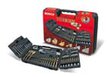 75-częściowy zestaw z serii "Titanium Plus" zawiera piętnaście wierteł HSH do stali trzy wiertła płaskie powlekane tytanem sześć wierteł do kamienia i pięć wierteł do drewna każde w popularnych wymiarach dziesięć 15-milimetrowych końcówek wkręcających i dwadzieścia cztery 25-milimetrowe końcówki wkręcające z tytanu do wszystkich popularnych śrub z rowkiem wzdłużnym rowkiem krzyżowym gniazdem Torx i gniazdem sześciokątnym. Uzupełnieniem zestawu są różne klucze nasadowe z adapterem średnicówka i poziomnica a także taśma miernicza uniwersalny uchwyt magnetyczny i pogłębiacz.