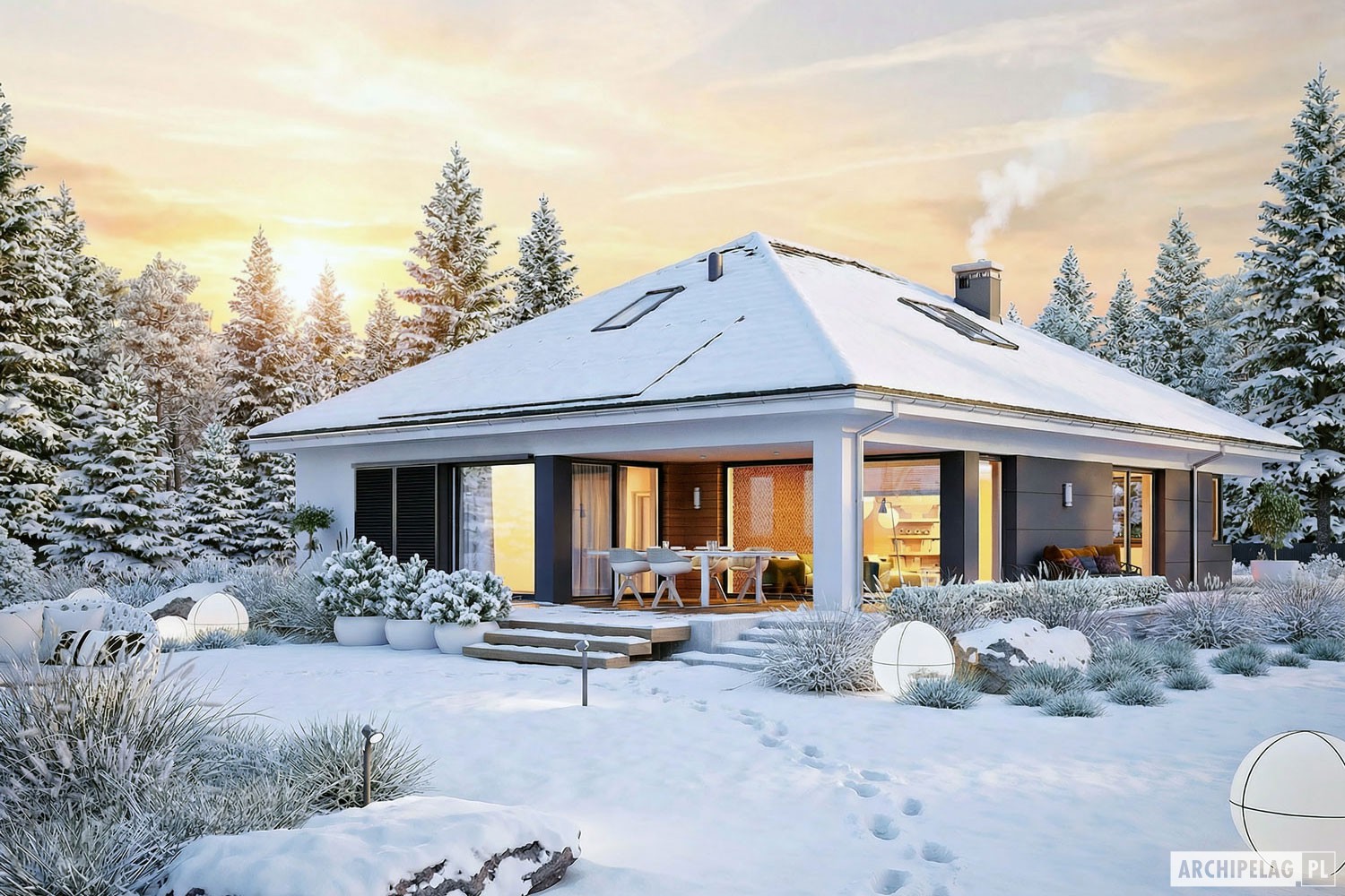 W powyższym domu zastosowany został system okien i drzwi MasterLine 8, który wyróżnia się nie tylko estetyką, ale również funkcjonalnością. W kuchni znalazło się okno narożne, a w pokojach drzwi balkonowe, dzięki czemu do wnętrza dociera znacznie więcej naturalnego światła. W salonie natomiast zastosowano drzwi podnoszono-przesuwne MasterPatio, które charakteryzują się minimalistycznym designem i umożliwiają integrację z różnymi stylami architektonicznymi. Oba systemy gwarantują doskonałe parametry termoizolacyjne i akustyczne, zapewniając komfort i oszczędność energii przez cały rok. Szeroka paleta kolorystyczna pozwoli na dobranie do nich właściwych osłon przeciwsłonecznych. W drzwiach przesuwnych MasterPatio można zastosować dodatkowo zintegrowaną moskiterę Flyscreen, której nie trzeba wypinać na zimę.