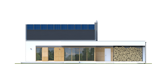 EX 11 G2 (wersja C) ENERGO PLUS to harmonia czystych połączeń i nowoczesna elegancja w najmodniejszym wydaniu. Uwagę zwraca ciekawie zaprojektowane zadaszenie – nad częścią mieszkalną zastosowano dach dwuspadowy, nad częścią gospodarczą – dach płaski. Dzięki takiemu zabiegowi udało się pomysłowo zaznaczyć podział domowych funkcji, a cała bryła zyskała oryginalny, wyrazisty charakter.  Największym atutem projektu są imponujące przeszklenia, dzięki którym granica między wnętrzem a ogrodem subtelnie się zaciera, a wnętrza zyskują słoneczny charakter.