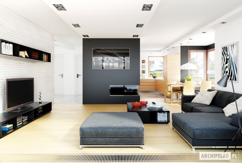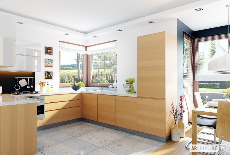 Projekt Mati G1 przedstawia nowoczesny i funkcjonalny dom jednorodzinny. Jego ciepły i ekskluzywny obraz nadaje elewacja z naturalnego drewna. Użycie w tym przypadku płyt HPL z naturalną okleiną drewnianą / fornir / firmy Prodema S.A. ma ogromne zalety: 1/ płyta jest całkowicie bezobsługowa, nigdy nie wymaga żadnej impregnacji. 2/ płyta jest wielkoformatowa – 2440 x 1220 mm co daje możliwość pocięcia jej na dowolne rozmiary. 3/ fornir ma dużo bardziej atrakcyjne usłojenie niż klasyczna deska co zapewnia niepowtarzalną i ekskluzywną estetykę 4/ dostępne 9 kolorów okleiny na bazie dwóch fornirów okume i ayous – kolory w katalogu. 5/ możliwość oklejenia drzwi wejściowych i drzwi garażowych tym samym kolorem forniru 6/ możliwa wersja płyty z dwustronnie widocznym fornirem co jest szczególnie istotne w przypadku żaluzji