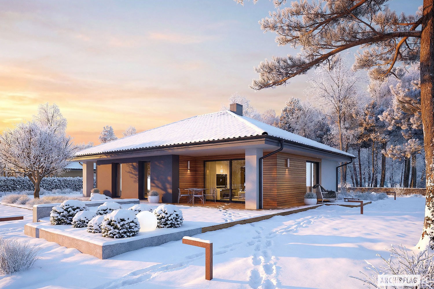 Mini 4 to tani w budowie dom, który uwodzi swoją przytulnością. Swój wyjątkowy urok projekt zawdzięcza niebanalnej elewacji, która stylowo łączy elegancką biel z modną szarością i drewnem. Prosta forma, klasyczny, czterospadowy dach, a w środku – wspaniale rozplanowane wnętrze z czytelnym podziałem stref zapewniają domownikom codzienną wygodę i ekonomiczny komfort cieplny.