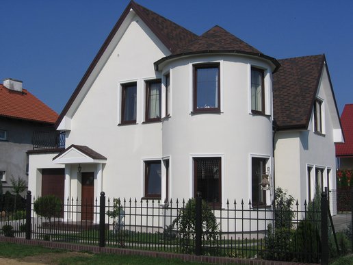 „Józefina” wyróżnia się bardzo elegancką formą. Bogato rozrzeźbioną elewację uatrakcyjnia efektowna wieża, w której znajduje się jadalnia (na parterze) i sypialnia (na piętrze). Jest to dom z użytkowym poddaszem, niepodpiwniczony z wbudowanym garażem, funkcjonalnie podzielony na strefę dzienną zajmującą parter i nocną mieszczącą się na piętrze. „Dom rozpoczęliśmy budować na przełomie 2002 i 2003 roku systemem gospodarczym, a oddaliśmy go do użytku w 2005 r. Zbudowany został technologią tradycyjną.” – mówi pani Magdalena, właścicielka prezentowanej realizacji. Projekt „Józefina” zachwycił nas swoją nietypowością i dlatego też, że lubujemy się w stylu "klasycznym" oraz przypominał swoim charakterem kamienicę. Dostrzegliśmy jego wyjątkowy urok. Kilku przeróbek wymagała elewacja. Projekt jest na tyle oryginalny, iż należało go wyciszyć, dopasować do naszego otoczenia. Dom ma "zgrabną" kubaturę, bardzo wymiarową oraz przestronne wnętrza - to przekonało nas głównie do wyboru tego projektu. Jest ładny na zewnątrz i w środku. Wieża nie każdemu może się podobać, ale dla nas tworzy integralną całość, nadaje niezwykłego klimatu w jadalni oraz w pokoju dziecięcym na piętrze. I ta obfita ilość światła dziennego, która przenika z każdej strony domu... Zmian w projekcie było kilka. Przede wszystkim: jeden poziom na parterze (w projekcie do salonu zejście po 2-3 stopniach), jedna duża 15.5 m2 łazienka na piętrze (w projekcie są dwie małe), na dole wc przeniesione do wiatrołapu (w projekcie pod schodami), powiększona kuchnia o likwidację spiżarki - została za to przeniesiona pod schody. Drzwi do garażu przeniesione są do wiatrołapu (w projekcie praktycznie drzwi wychodziły z salonu - dla mnie było to nienajlepsze rozwiązanie, przy tak otwartym charakterze parteru). Kosztem wiatrołapu zrobiliśmy jeszcze wnękę na szafę. Kominek został przeniesiony ze ściany zewnętrznej - do wewnątrz domu, żeby ogrzewał go od środka. Na zewnątrz nie zrobiliśmy takiej ilości sztukaterii jak w projekcie oryginalnym, żeby nie tracić prostoty w elewacji, zaś schody i daszek są bardziej subtelne i delikatne od zaplanowanych przez autora.. W domu mieszka się fantastycznie, jest przestrzenny, doświetlony w każdym calu. Szczerze polecam go wszystkim odważnym inwestorom!”.