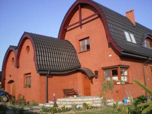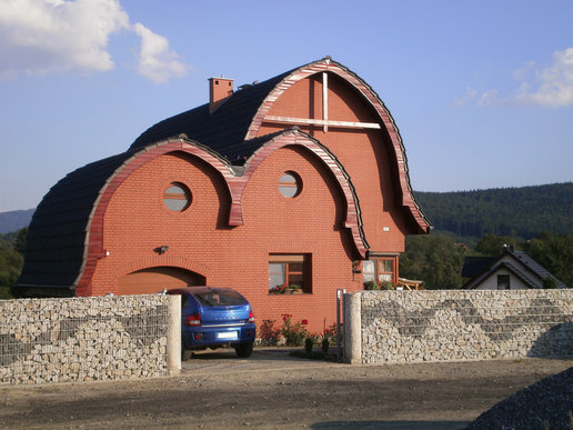 Dom Karii G1 cechuje oryginalna i niepowtarzalna architektura, która sprawia, że budynek wyróżnia się z okolicznej zabudowy. Miękka linia dachu, brak wyraźnych załamań oraz zaokrąglona stolarka okienna nadają mu wrażanie domku z bajki. Elewację wykończono okładziną klinkierową, z którą zgrabnie kontrastują drewniane detale i dachówka w ciemnym kolorze. Inwestorzy dokonali jednej ważnej zmiany w projekcie – przesunęli garaż, dzięki czemu wygospodarowano dodatkowe pomieszczenia w przedniej części budynku. Projekt wymagał także dostosowania do specyficznych wymagań działki ze spadkiem.