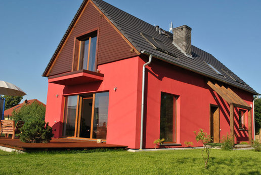 Rena to prosty i tani w budowie dom z poddaszem, który świetnie sprawdzi się na wąskiej działce. W prezentowanej realizacji właściciele postawili na odważny kolor i stylowe wykończenie elewacji, dzięki czemu ich wymarzony dom wyróżnia się na tle innych obiektów w okolicy. Poznaj go bliżej!